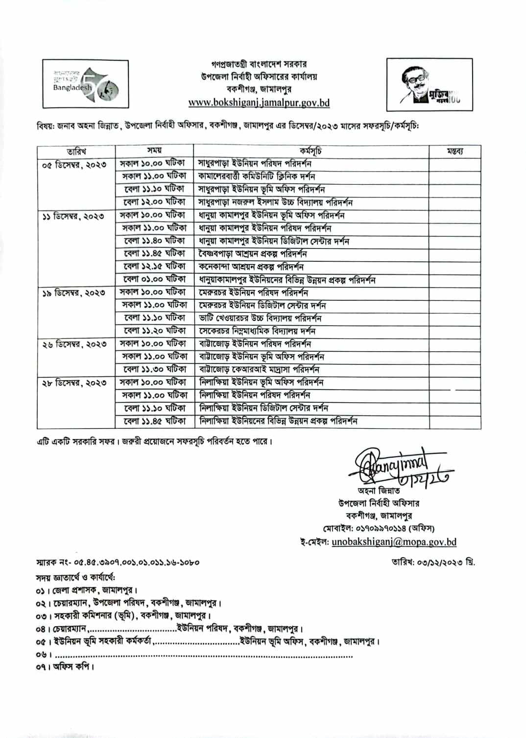 উপজেলা প্রশাসন, বকশীগঞ্জ এর মাসিক কর্মসুচি